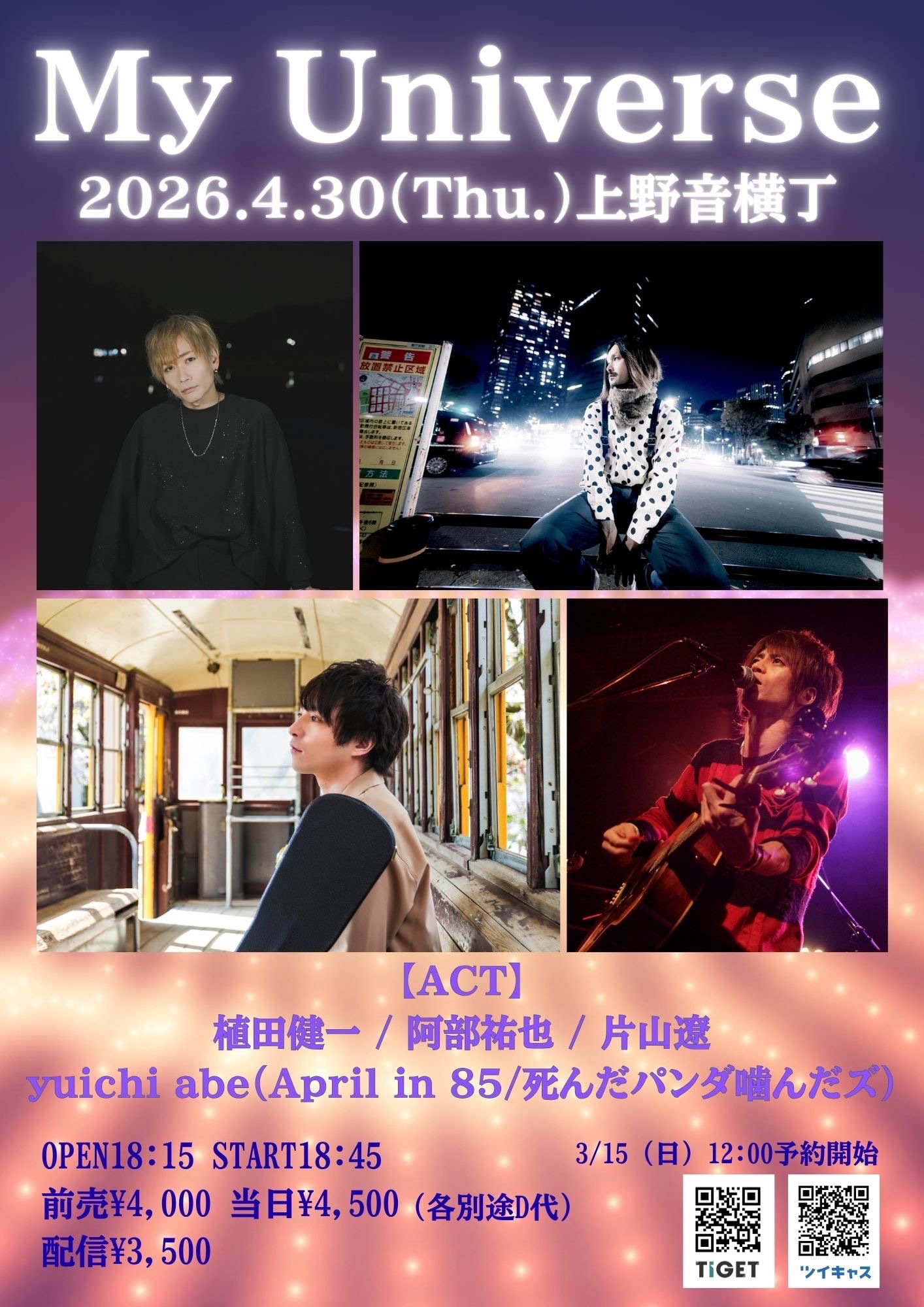 会場チケット:前売り¥3,500/当日 ¥4,000(1drink別)